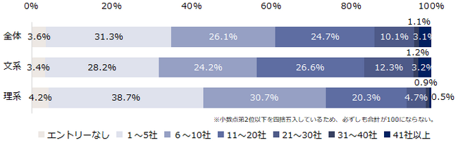 本選考にエントリーした(予定している)企業数を伺うと、文系の平均は「14.5社」、理系は「9.7社」でした。文系理系いずれも「1〜5社」が最多(文系:28.2%、理系:38.7%)でしたが、理系学生はより厳選傾向にあることが分かりました。