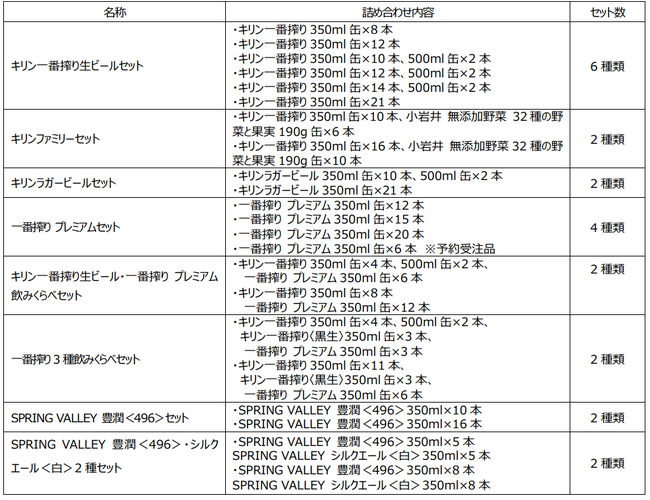 今年も、おいしさで人気の「キリン一番搾り生ビールセット」に加え、第一等品東北産ホップをふんだんに使用した「一番搾りプレミアム」や、「一番搾り」の黒ビールである「キリン一番搾り〈黒生〉」など、人気の「一番搾り」シリーズを楽しめるアソートセットを発売します。また、直近のクラフトビールのニーズの高まり※を踏まえ、クラフトビール「SPRING VALLEY豊潤<496>」・「SPRING VALLEYシルクエール<白>」が入った「SPRING VALLEY豊潤<496>・シルクエール<白>2種セット」なども展開します。さらに、清涼飲料を含むファミリーギフトに「小岩井 無添加野菜 32種の野菜と果実」を新たに採用しました。