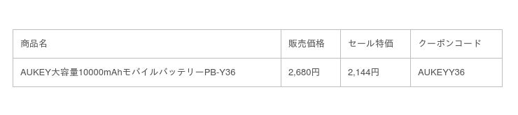 AUKEY大容量10000mAhモバイルバッテリーPB-Y36(URL:https://amzn.to/2A5xn0m)20%オフセールをAmazon.co.jpにて開催致します。6月27日(土)から7月1日(水)まで限定、クーポンコード「AUKEYY36」を利用することで2,144円でご購入いただけます。