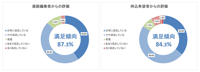 漫画編集者から「非常に満足している」「やや満足している」は合計87.3%、持ち込み希望者の「非常に満足している」「やや満足している」は合計84.3%という結果になりました。