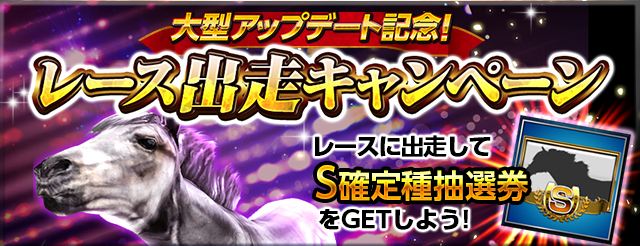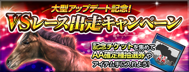 2015年11月5日(木) 17:00 〜 11月18日(水) 23:59までのキャンペーン期間中、VSレース出走キャンペーンとして、VSレースに出走する事で、一日一枚「大型アップデート記念チケット」をプレゼントいたします。「大型アップデート記念チケット」の集めた枚数で、AAランク確定種抽選券や、ゲーム内アイテムと交換することができます。