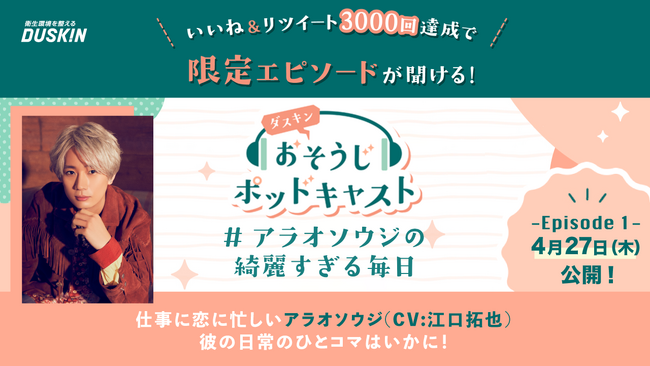 株式会社ダスキン(本社:大阪府吹田市、社長: 大久保 裕行)は、声優の江口拓也さんを起用した【ダスキンおそうじポッドキャスト】にて、「アラオソウジの綺麗すぎる毎日」のエピソード1 「オフィスでの忙しすぎる一日」篇を4月27日(木)午前10時より、配信します。本番組は、Twitterで募集した「おそうじで気持ちいい瞬間のエピソード」や江口さん演じる「アラオソウジ」に言って欲しい「褒められたいセリフ」「キュンとする言われたいセリフ」など、一般ユーザーのアイデアを盛り込んで構成した、全3話から成るおそうじや家事の時間がちょっと楽しくなるボイスドラマです。