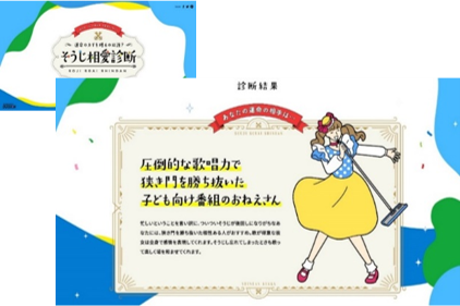 診断テストを通じて、自身のおそうじ指数が測れるほか、おそうじを擬人化したキャラクターたちが、診断結果に応じたおすすめのおそうじ方法をアドバイスしてくれる診断コンテンツです。