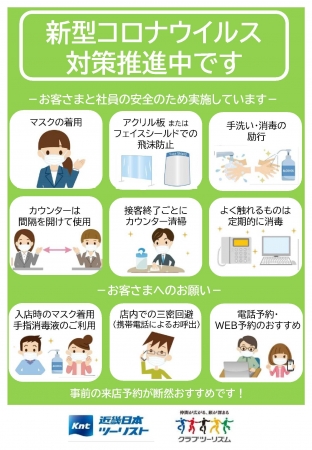 再開にあたり、KNT-CTでは、(一社)日本旅行業協会及び(一社)全国旅行業協会により策定された「旅行業における新型コロナウイルス対応ガイドライン」に準拠した当社独自のガイドラインを策定し、グループ各社に周知徹底してまいります。そして、「3密回避」、「徹底した衛生管理」、「従業員の健康管理」を前提に、ご来店いただけるお客様にとって安心・安全な店舗体制の構築に努めてまいります。