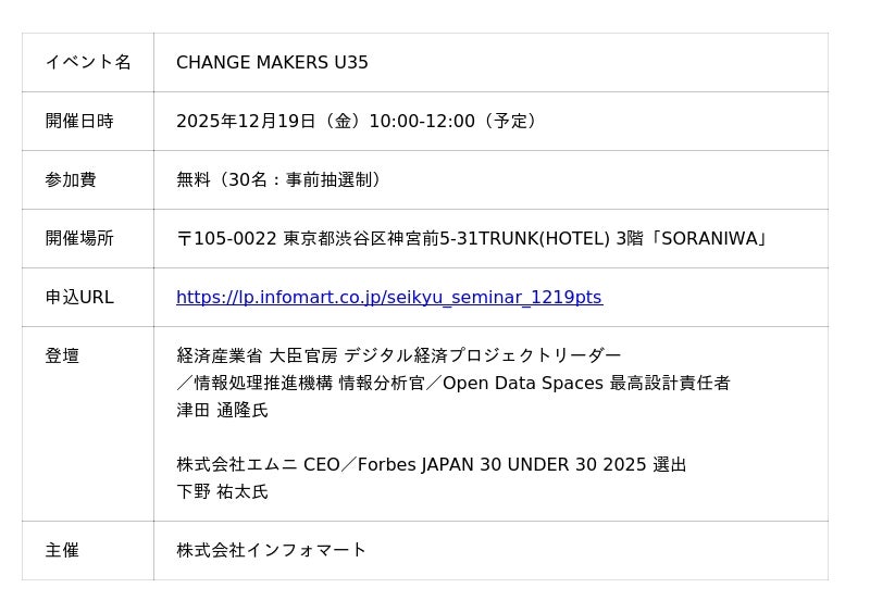 デジタルの力であらゆる業務を効率化する株式会社インフォマート(本社:東京都港区 代表取締役社長:中島 健、以下「当社」)は、日本のデジタル課題に挑む35歳以下のチェンジメーカーを対象とした双方向コミュニケーションイベント「CHANGE MAKERS U35」を、2025年12月19日(金)に渋谷区 TRUNK(HOTEL)にて開催します。