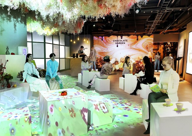 「桜彩 OUSAI(オウサイ)」エリアにカフェテーブルなどを配置することで、空間全体に浮かび上がる四季の美しさに包まれながら、ゆったりとした時間を過ごしていただくことができます。また、「WILD FLOWER GARDEN」でブレンドした茶葉はお持ち帰りいただくことも出来ますが、向かいの「CHOCOLATE GARDEN(チョコレート ガーデン)」にお持ちいただくと、お湯を入れて会場内で楽しめる美容ブレンドティーとしての提供も可能。「CHOCOLATE GARDEN」で自身に必要なメディカルチョコレート※1を受け取った後に、「WILD FLOWER GARDEN」の美容ブレンドティーと一緒に楽しんでいただくのもオススメ。