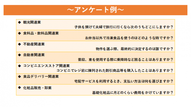 消費者である主婦をはじめ「実態」のある「生の声」としてアンケートの回答を得る事が出来るので、一般的なアンケート調査を行う多くのアプリ系モニターとは違い「定量的」な数値情報だけでなく「定性的」な「質」に関する情報を集める事が出来ます。