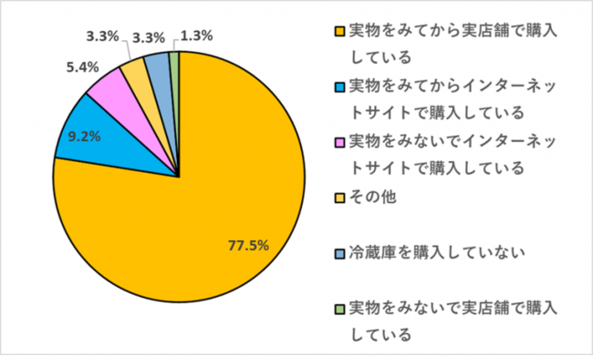 冷蔵庫の購入方法については、「実物をみてから実店舗で購入している」が77.5%、「実物をみてからインターネットサイトで購入している」が9.2%と、8割以上の人が実物を見たうえで購入していることが分かりました。