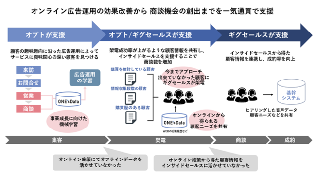 オプトが提供する統合データ活用プラットフォーム「ONE‘s Data(ワンズデータ)」(※2)へ、商談・成約に至ったユーザーのオフラインデータを蓄積いたします。蓄積したオフラインデータをオンライン広告の運用に活用することでお客様サービスとの親和性の高いユーザーの集客と商談数増加を狙います。