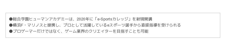 また、教育提携校である学校法人佐藤学園ヒューマンキャンパス高等学校の横浜学習センターにおいて、専門コースeスポーツ専攻として、2019年4月より横浜F・マリノスのプロ選手による授業を開始しております。