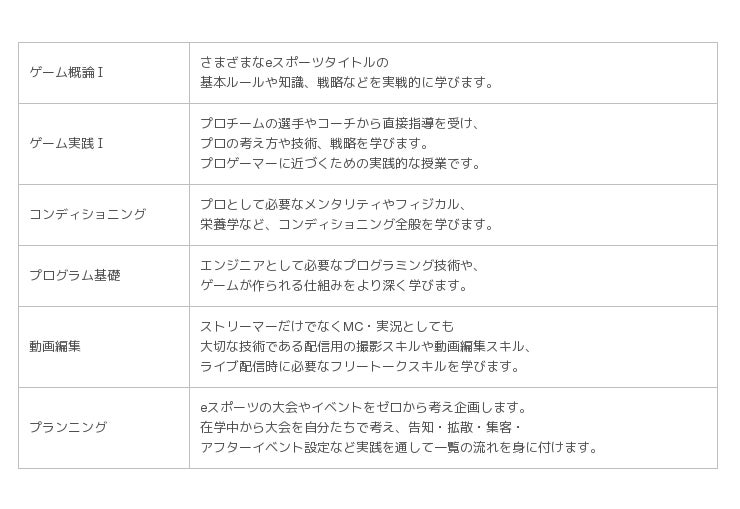 プロゲーマーとして活躍するために必要な戦術・戦略・スキルを学びます。ゲームを「競技」として捉え、ここ数年で飛躍的に成長したeスポーツ分野において、プロゲーマーとして活躍するために必要な戦術・戦略・スキルを学ぶとともに、最新のゲーミングデバイスを使い、全国の仲間と日々切磋琢磨しながら学べることが特長です。