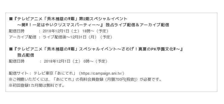 また、昨年夏に開催された『「斉木楠雄のΨ難」スペシャルイベント〜さわげ!真夏のPK学園文化Ψ〜』のアーカイブ配信も12月1日(土)から再び独占配信予定となっております。