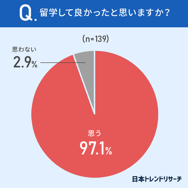 97.1%と、ほとんどの方が留学して良かったと「思う」と回答しています。