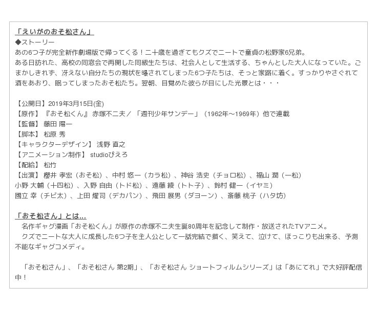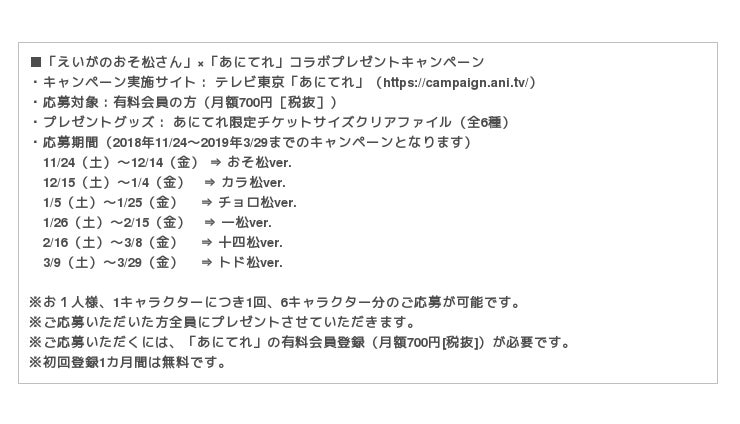 2019年3月15日(金)に「えいがのおそ松さん」が劇場公開されることを記念して、「えいがのおそ松さん」とテレビ東京アニメ見放題サービス「あにてれ」によるコラボプレゼントキャンペーンを実施することが決定いたしました。