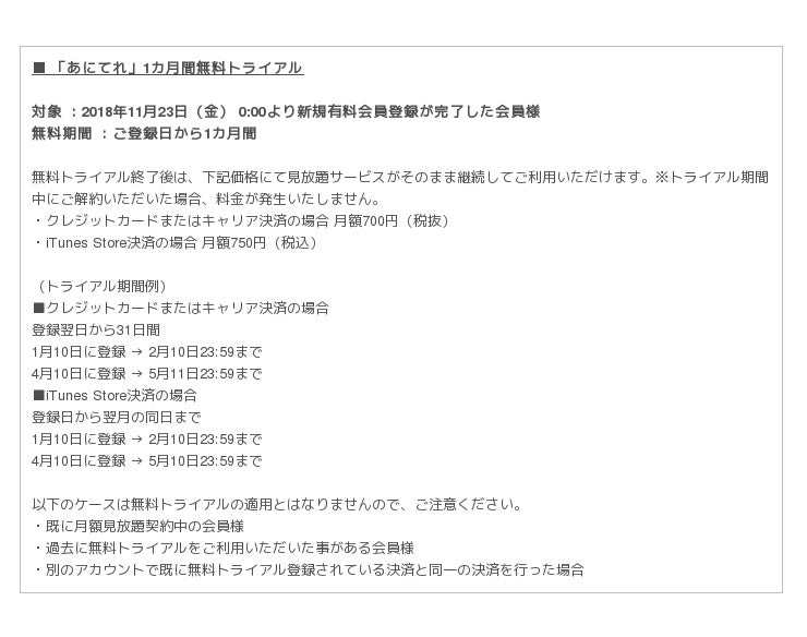 11月23日(金)以降、「あにてれ」に新規有料会員登録いただくと、レンタル販売のコンテンツを除く「あにてれ」の定額サービスを1カ月間無料でお楽しみいただけます。この機会に是非ご体験ください。