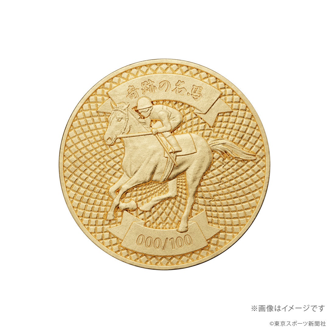 このたびの新作はトウカイテイオーの奇跡のレースをモチーフにした純金コインです。田原成貴氏の直筆サイン入り桐箱と、同馬の戦績を記載したアクリルスタンド、1993年12月26日付東京スポーツ新聞掲載の有馬記念出馬表を特典としてお付けします。(予約期間内でも限定数に達し次第、受付終了となります)