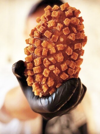 【小麦の奴隷】の看板商品である「ザックザクカレーパン」は、「カレーパングランプリ(R)」で4年連続金賞を受賞。パンの周囲全てにクルトンを貼りつけて揚げるカレーパンで、ザクザクな食感が想像できる見た目にも注目です。一口食べると香ばしくザックザクとした心地良い食感がクセになります。パンの中には特製スパイスを使用したルーとごろっとしたジャガイモがたっぷり詰められており、独自開発したもっちりとした生地は冷めても美味しいと評判です。