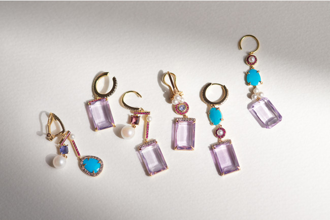 ブランドで一番の人気を博す “elafonisi (エラフォニシ)”シリーズから、大ぶりのアメジストを基調とした色鮮やかなシングルピアス5型とイヤリング5型、イヤーカフ1型がラインナップ。
