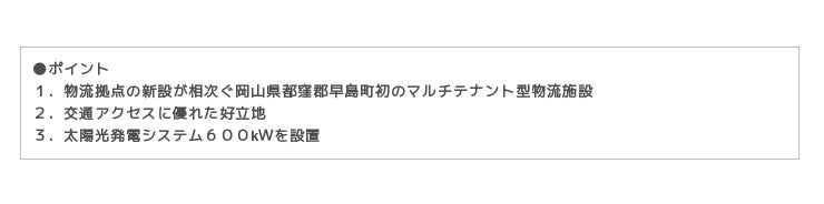 1.物流拠点の新設が相次ぐ岡山県都窪郡早島町初のマルチテナント型物流施設