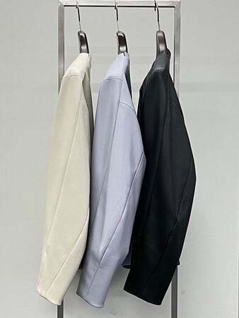 襟元は、ラウンドよりも少しVネック寄りにした、シャープなノーカラーです。後ろをチビスタンドカラーにすることで、首回りがスッキリ華奢に見え、ハードな素材に対して上品さが加わります。