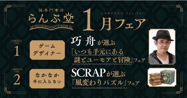 合同会社TOKYO MYSTERY CIRCUS(所在地:東京都新宿区、代表社員:加藤隆生)が運営する、世界初・国内最大となる"謎"のテーマパーク「TOKYO MYSTERY CIRCUS(以下、東京ミステリーサーカス)」は、2022年1月1日(土)より「謎専門書店 らんぷ堂」にて、「ゲームデザイナー巧 舟が選ぶ『いつも手元にある謎とユーモアと冒険』フェア」および「なかなか手に入らないSCRAPが選ぶ『風変わりパズル』フェア」を開催することを発表いたします。