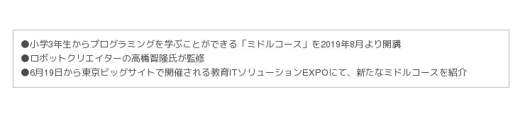 ヒューマンホールディングス株式会社の事業子会社で、教育事業を運営するヒューマンアカデミー株式会社(本社:東京都新宿区、代表取締役:川上 輝之、以下 ヒューマンアカデミー)は、「ヒューマンアカデミーロボット教室」にて、ミドルコースをリニューアルいたします。新たなミドルコースにはタブレットを使ったビジュアルプログラミングを学習内容に加え、2019年8月に開講します。なお、6月19日(水)から東京ビッグサイト青海展示棟で開催される「第10回教育ITソリューションEXPO」にて、新たなミドルコースをはじめとしたヒューマンアカデミーロボット教室のロボットの展示やサービス内容の詳しい説明を実施します。
