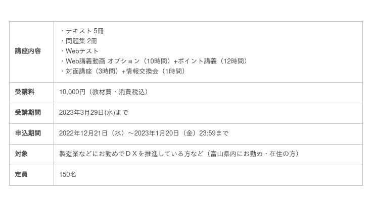 富山県内で製造業などにお勤め・在住の方限定で、受講後にDXサポーターとして県の認定・登録されます。