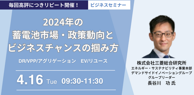 JPI(日本計画研究所)は、株式会社三菱総合研究所 エネルギー・サステナビリティ事業本部 グループリーダー 長谷川 功 氏を招聘し、蓄電池の市場動向・政策動向を紹介し、今後の見通しやビジネスチャンスについて詳説いただくセミナーを開催します。