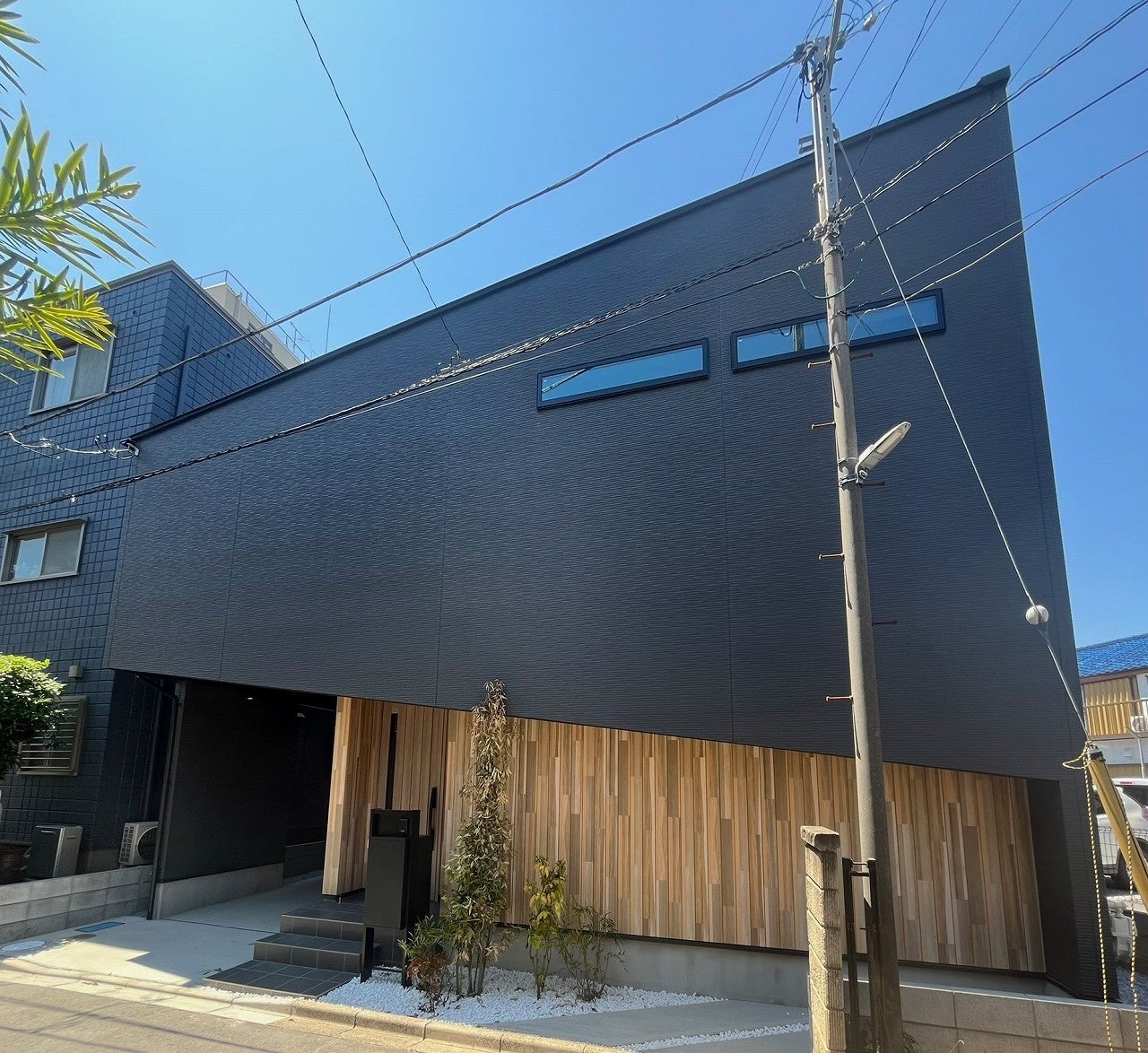 デザインのポイントは、外壁材「トランディウッド」と「ルストナ」を組み合わせた立体感のあるファサードです。奥行きのあるバルコニーで道路側からの視線を遮りつつ、サッシを目立ちにくくすることで木目調を強調しました。さらに、セットバックしたバルコニー周りの構造体がアルファベットの「F」のような特徴的な形状を描いており、これにより生まれる陰影が、建物の奥行き感を表現することができました。また、デザインの意図としてコラム部分をあえて太く設計することで、バルコニーの腰壁部分との縦横比を視覚的に調整し、外観全体のバランスを考えました。