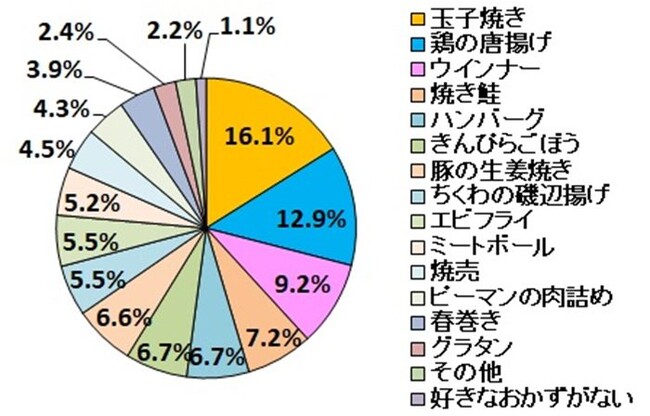 トップは「玉子焼き」で回答数の16.1%、回答者数ではほぼ7割に相当する713人。2位は「鳥の唐揚げ」(12.9%、571人)、3位は「ウインナー」(9.2%、410人)でした。