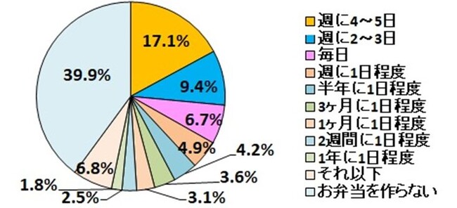 お弁当を作る頻度は、「週に4〜5日」が17.1%と最多で、その後は「週に2〜3日程度」9.4%、「毎日」6.7%、「週に1日程度」4.9%と続きました。 尚、「週に1日程度」以上の頻度が上位4つに並び、合わせると38.1%で、全体の4割近くの方が週1日以上の頻度でお弁当を作ることがわかりました。
