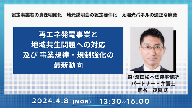 JPI(日本計画研究所)は、森・濱田松本法律事務所 パートナー・弁護士 岡谷 茂樹 氏を招聘し、再エネ発電事業者の規制強化の最新動向や事業者などの関係者が取るべき対応について詳説いただくセミナーを開催します。