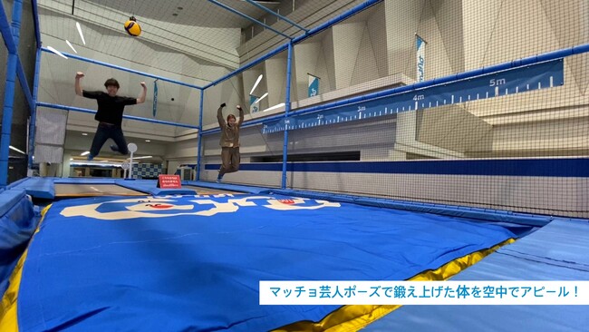 トランポリンを跳んで、空中でマッチョポーズを決めろ!※足から落ちるポーズのみ。危険なジャンプは禁止です。