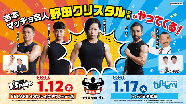 株式会社バンダイナムコアミューズメントは、『吉本マッチョ芸人 野田クリスタルたちがやってくる!in VS PARK・トンデミ』を「VS PARK イオンレイクタウンmori店」にて2023年1月12日(木)、「トンデミ平和島」にて2023年1月17日(火)に開催します。