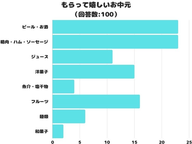 もらって嬉しいお中元をアンケートにて調査したところ、1位は「ビール・お酒」「精肉・ハム・ソーセージ」でした。