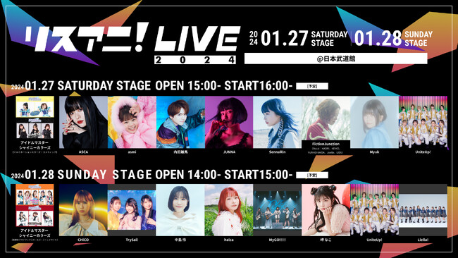 『リスアニ!LIVE』は、アニメ音楽誌『リスアニ!』がプロデュースする音楽フェスです。初回の2010年から“臨場感とサウンドを大切にしたライブ”をコンセプトに、全曲すべて生バンドによる演奏で行われています。14回目となる今回は、2024年1月27日、28日に東京・日本武道館で開催されます。