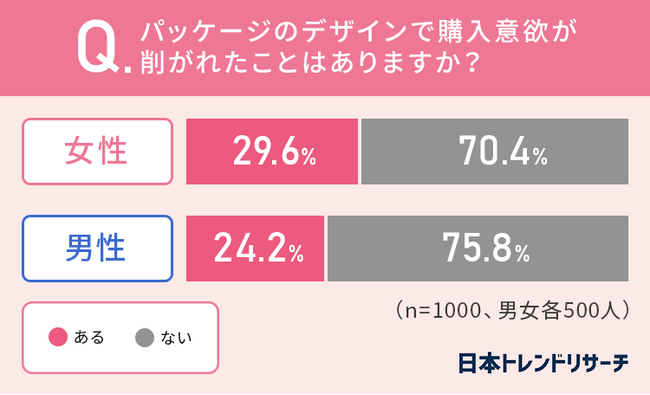 さらに「パッケージのデザインで購入意欲が削がれたことはあるか?」という問いには、女性の29.6%、男性の24.2%が「ある」と回答しています。