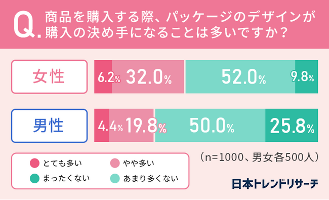また「パッケージのデザインが購入の決め手になることは全くない」と回答したのは男性が25.8%なのに対し、女性は9.8%でした。