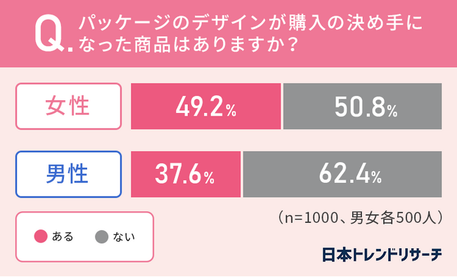 女性の49.2%、そして男性の37.6%が、パッケージのデザインが購入の決め手になった商品が「ある」と回答しています。