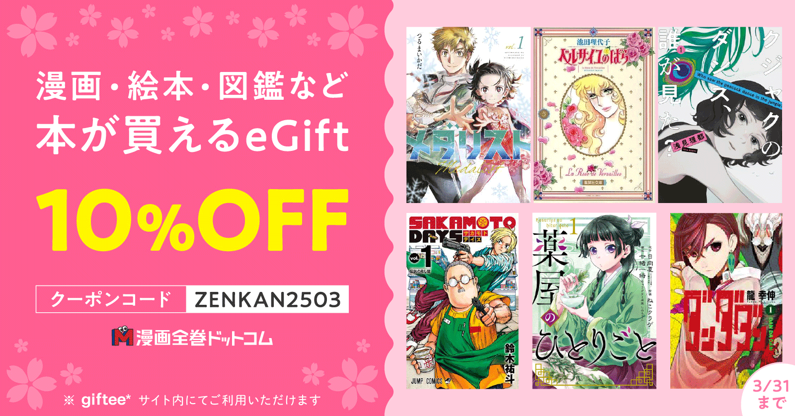 漫画全巻ドットコムは3月17日より期間限定で10%OFFクーポンコードをeギフト販売サービス「giftee (R) 」内の対象商品のギフト詳細ページにて配布しております。