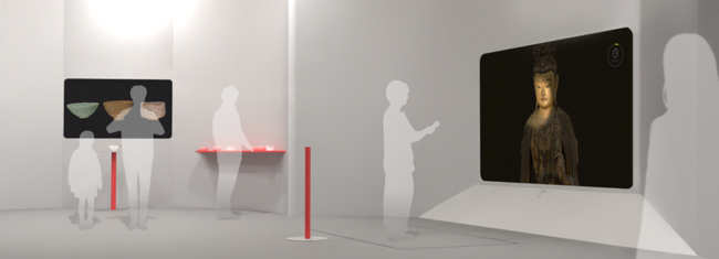 ※3 当社の「8Kインタラクティブミュージアム」をベースに文化財活用センターおよび東京国立博物館と共同で開発したものです。美術品や工芸品などの文化財の3DCG画像を、8Kディスプレイに映し出し、拡大・縮小、回転しながら、細部まで鑑賞することが可能です。