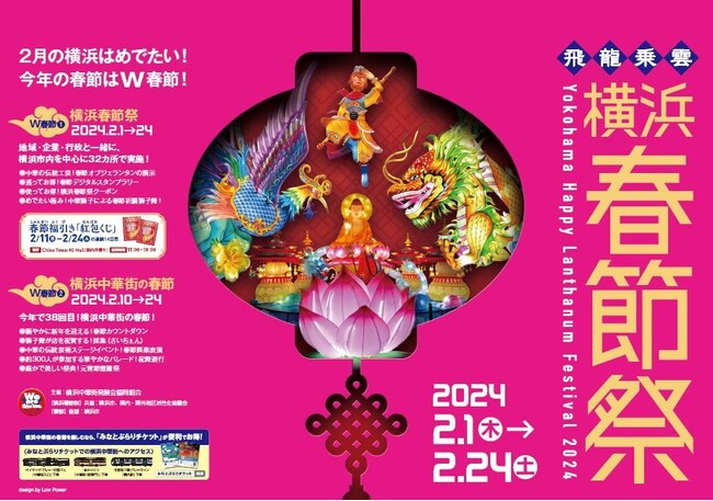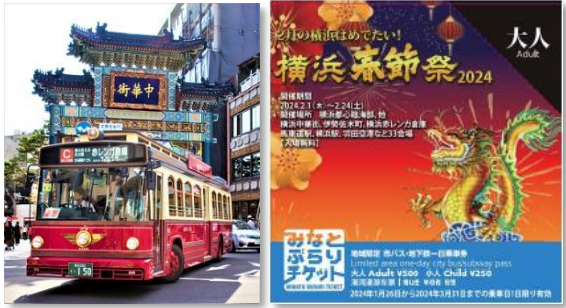 横浜市交通局が販売している「みなとぶらりチケット」に「横浜春節祭」限定デザインが登場します(3,000枚限定)。本チケットは、「あかいくつ」や「ベイサイドブルー」を含むベイエリアの横浜市営バス・地下鉄が1日乗り放題で、約110の店舗・施設等で割引等の特典がついた横浜春節祭2024と横浜観光を満喫するのにぴったりなお得チケットです。