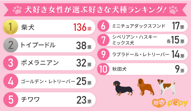 株式会社NEXER(本社:東京都豊島区)の100%子会社であるpepy株式会社(本社:東京都豊島区)は、ペットを愛する人のためのお役立ち情報を発信するメディア『pepy』にて、現在犬を飼っている女性300人を対象に『好きな犬種』についてアンケートを実施しその結果をサイト内にて公開しました。