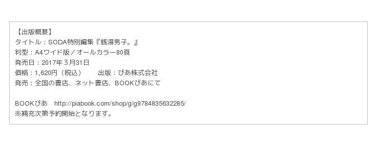 ぴあ株式会社では、2017年3月31日に発売した、「SODA特別編集『銭湯男子。』」を、このたび重版することが決定いたしました。