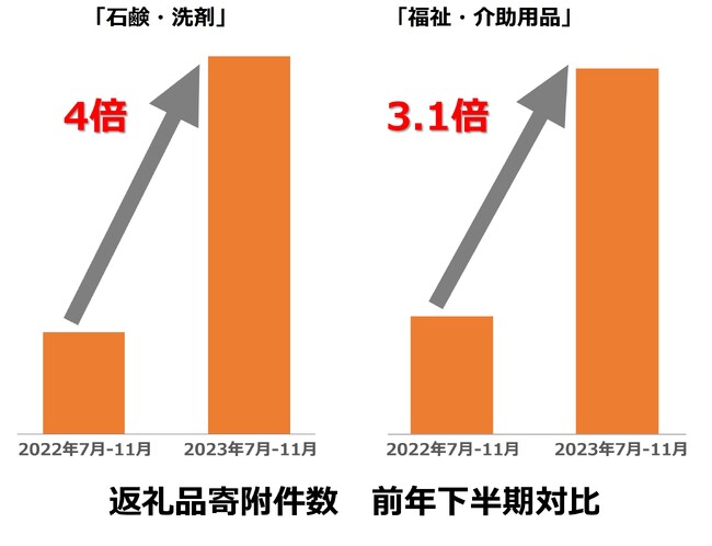 “トイレットペーパー“や“ティッシュ” を含む「福祉・介助用品」への寄附は3.1倍となり、少しでも家計を助けようと、ふるさと納税を活用した方も多く見られました。