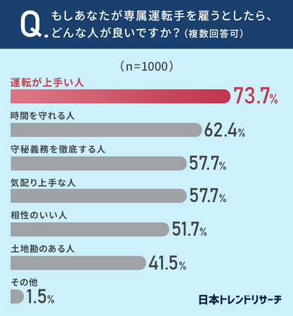 まずは、もしあなたが専属運転手を雇うとしたら、どんな人が良いか複数回答で聞いてみました。