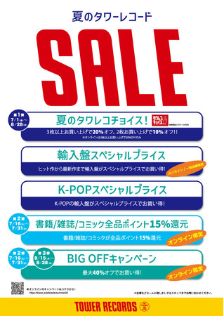タワーレコードは7月1日(金)から8月28日(日)にかけて、名盤や名著がお得にご購入いただける「夏のタワーレコードSALE」をタワーレコード店舗とオンラインで開催します。
