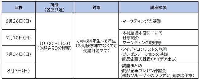 今回は、小学校4年生から6年生を対象に、「マーケティングの基礎知識」から、「商品開発の考え方」、「プレゼンテーションとは」等のテーマを通して、新商品が生み出されるサービスの仕組みを学べる内容となっております。また夏休み期間中にはアイデアコンテストを予定し、優秀なアイデアは木村屋總本店にて商品化の可能性もあるため、是非奮ってご参加ください!