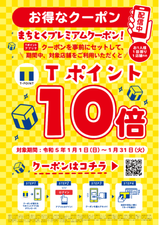 1月からは「クーポンセットでお買い物!ポイント10倍キャンペーン」と題し、2023年1月1日(日)から1月31日(火)の期間中に、「Tポイントアプリ」から該当の「Tカードクーポン」をセットして、対象店舗でお買い物をするとTポイントが10倍貯まります(クーポン特典の上限1,000ポイント)。また、2月は「Tカードクーポン」をセットしたお買い物でTポイントが10ポイントもらえるキャンペーン、3月はTポイント100万ポイント山分けに参加できるキャンペーンをご用意しています。ぜひ、この機会にあなたの街でTポイントが貯まる・使えるお店をチェックし、キャンペーンにご参加ください。
