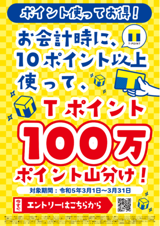 事前に参加エントリーをして、期間中に対象のお店でのお会計でTポイント10ポイント以上をご利用いただくと、「Tポイント100万ポイントの山分け」にご参加いただけます(上限おひとり様2,000ポイントまで)。